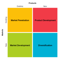 - Ansoff Matrix: Ansoff's product/market development grid recommends that a business' endeavors to develop rely upon whether it markets existing or new products in existing or new business sectors. The yield from the Ansoff product/market matrix is a progression of recommended development techniques that set the heading for the business procedure. In an Ansoff Matrix, there are four quadrants. Taking the example of coca-cola: