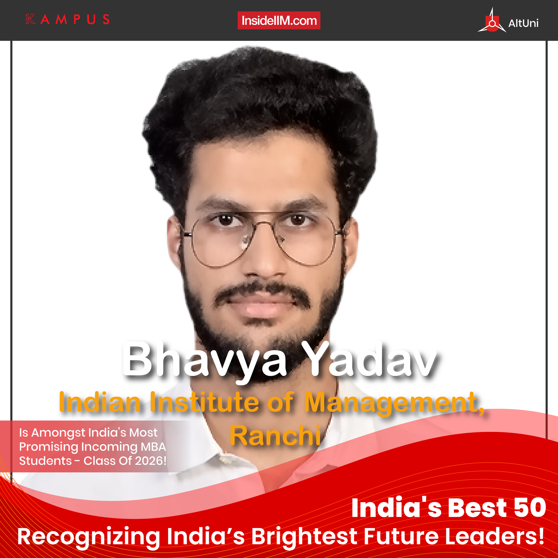 Selected as one of the Best 50 of India's Most Promising Incoming MBA Students 2024, Bhavya Yadav blends values-led leadership with execution in fast-moving settings. As a Placement Coordinator, she runs transparent, student-first processes and handles high-stakes stakeholder management with calm, structured communication. A marketer at heart with a finance backbone, Bhavya is targeting FMCG—already upskilling through a digital marketing & analytics specialization and applying it in projects to sharpen segmentation, performance metrics, and campaign optimization. On campus, Bhavya leads teams in case competitions, mentors peers into internship offers via tailored mock interviews and feedback, and still makes room for competitive sport—gold medalist in table tennis at IIM Ranchi’s annual sports fest. Across roles, Bhavya’s signature is consistent: integrity in decision-making, empathy in team dynamics, and perseverance when the clock is ticking.