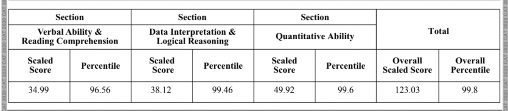 Percentile : 99.80 (LRDI - 99.46 ,Quant - 99.6, VARC - 96.56) Score : 123.03