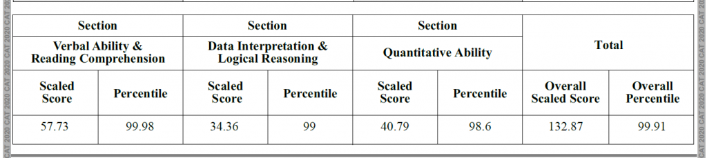 Overall Score - 132.87, Overall Percentile - 99.91 | VARC: 57.73, 99.98 | DILR: 34.36, 99 | QA: 40.79, 98.6 99