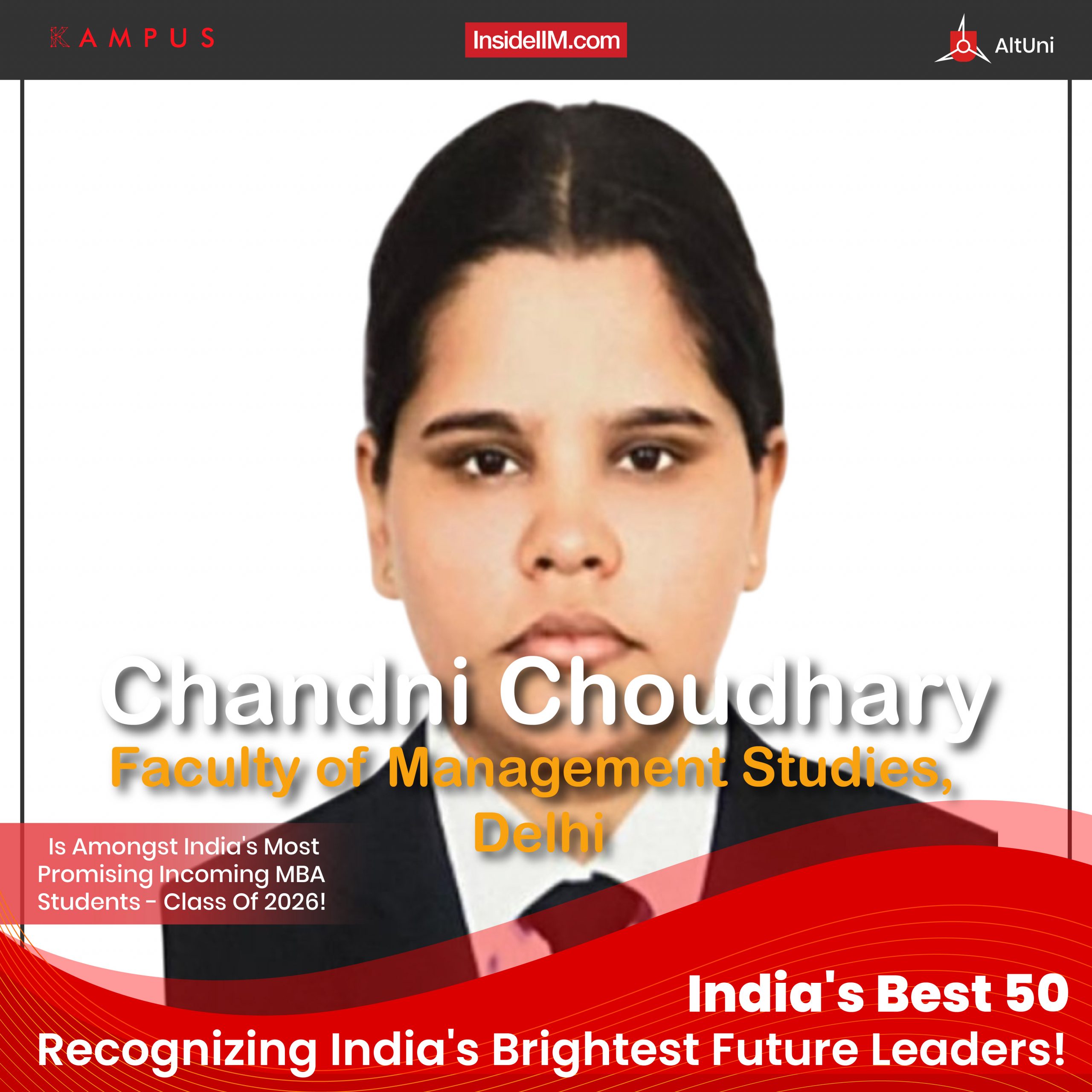 Selected to the Top 50 of India’s Most Promising Incoming MBA Students 2024, Chandni Choudhary (MBA, FMS Delhi) blends policy literacy, finance, and large-scale student leadership. A law graduate (LLB, DLC-2) with an MA in Political Science, she served as Research Assistant at CBIC, authoring Interpreting Baggage Rules Declaration and helping design e-hearing procedures—work that married legal rigour with process innovation. In parallel, she managed an INR 1 crore investment portfolio, sharpening risk discipline and client stewardship. As Cultural Secretary, DUSU, she led programming across 13 colleges for 5,000+ students, building inclusive, execution-strong teams. Her slate of recognitions—Prime Minister’s Scholarship, Dhirubhai Ambani Scholarship, and top 1.5% in KVS—sits alongside wins beyond the classroom: Sanduro MTB Challenge (2023), HCL Cyclothon finishes, the Atulya Ganga Cyclothon, and 500+ hours of service with NGO UMEED. She keeps upskilling through BCG’s Strategy Consulting Virtual Experience and workshops on climate governance & stakeholder engagement, signalling a leader who can operate where regulation, sustainability, and business intersect. At the Faculty of Management Studies, Delhi, she is set to operate where regulation, sustainability, and business intersect.