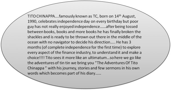 First day at Citrus Bank Private Ltd and Tito Chinappa walks down the red carpet in his well ironed suit, matching tie of course and not to ignore the shiny shoes!!! Inside the elevator and out, there he is on the floor dedicated to “Corporate Banking”. He enters and (eyes almost popping out) - Ms Senorita D’cruz (the tall, blonde and beautiful girl) the HR executive is there waiting for him. She has been given the responsibility to introduce Tito to various aspects of finance and help him make a choice (Tito can’t believe his luck) and the introduction begins……………….