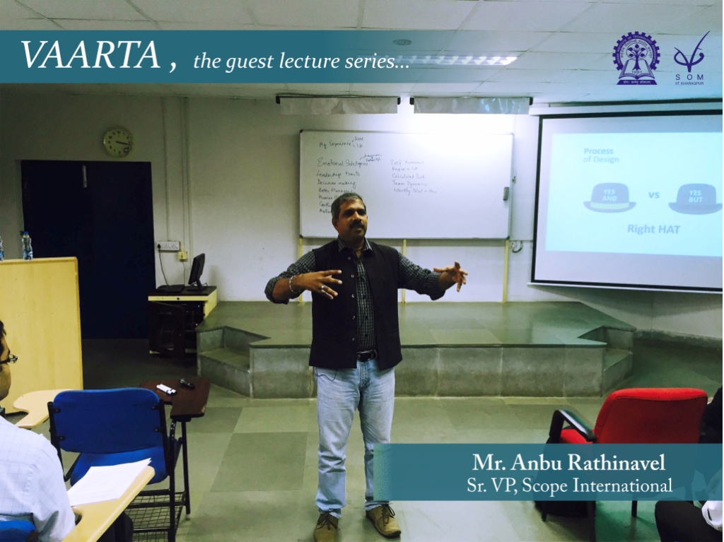 On the 12th of November and under the renowned Vaarta’15 guest lecture series, Vinod Gupta School of Management, IIT Kharagpur had the honor of hosting Mr.AnbuRathinavel, Senior Vice President, Scope International, a Standard Charted subsidiary. He delivered an enthralling lecture on the “Design Thinking and its importance” and thus marked a glorious end to the guest lecture series of the autumn semester,2015.