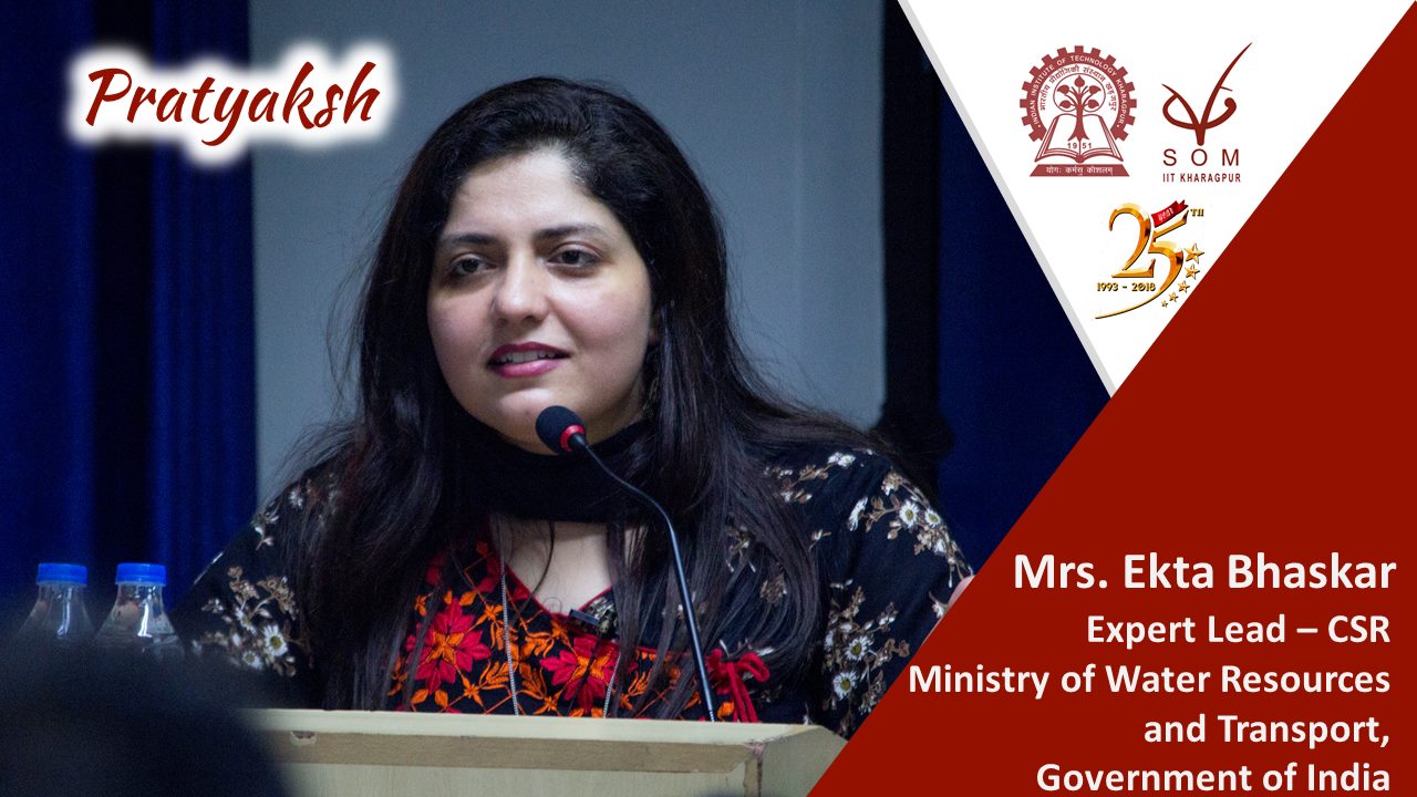 Vinod Gupta School of Management, IIT Kharagpur since its inception has had very close ties with the corporate world. This time around we had gone ahead and forged a lasting relationship with the public sector. As a part of the ongoing guest lecture series ‘Pratyaksh,’ we had the privilege of hosting Mrs. Ekta Bhaskar, Expert Lead – CSR/ Commercial Project, Ministry of Water Resources and Transport, Government of India.