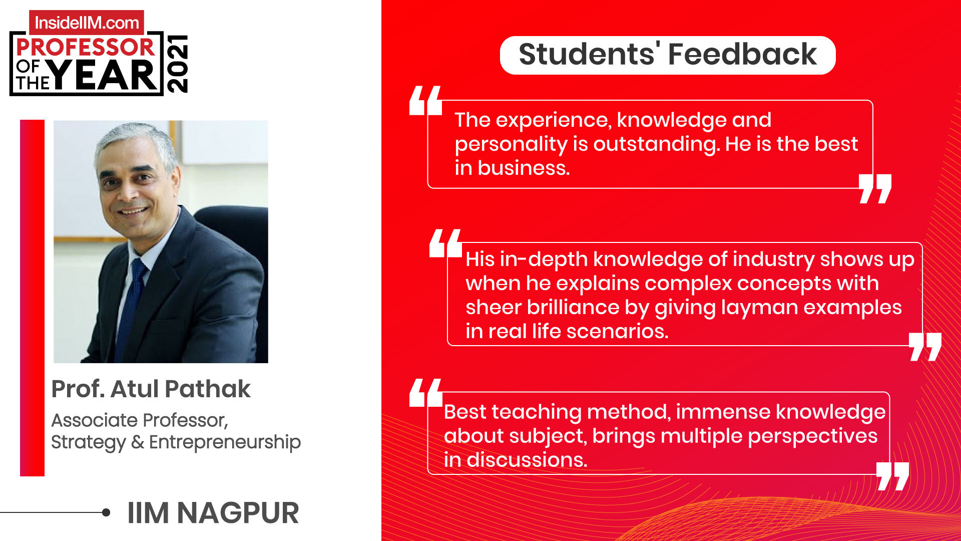 ‘I had heard almost all the fairy tales about this guy. In the third trimester, I got to live the fairytale myself. It felt like we were on a cruise just sailing through the waters of strategy with Prof. Pathak in the driver’s seat. Such was the finesse with which he taught the class. A charming personality clubbed with sheer amount of knowledge. He deserves to be the Professor Of The Year for IIM Nagpur.’