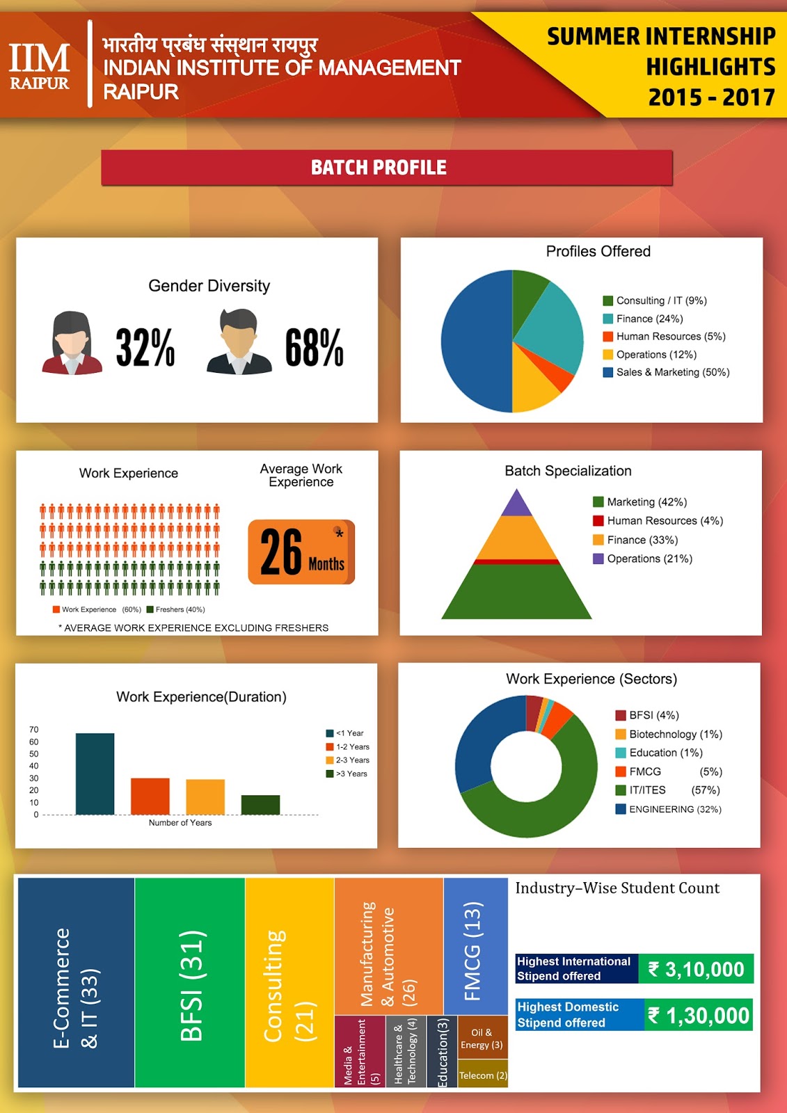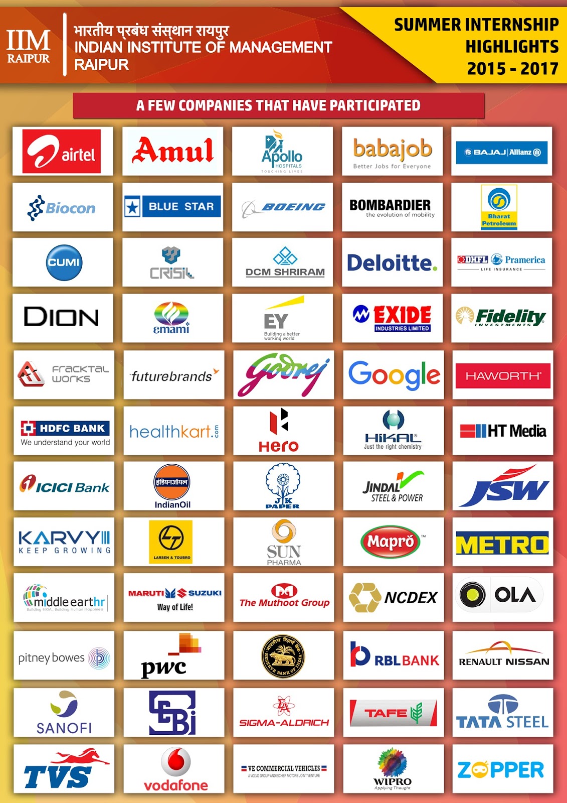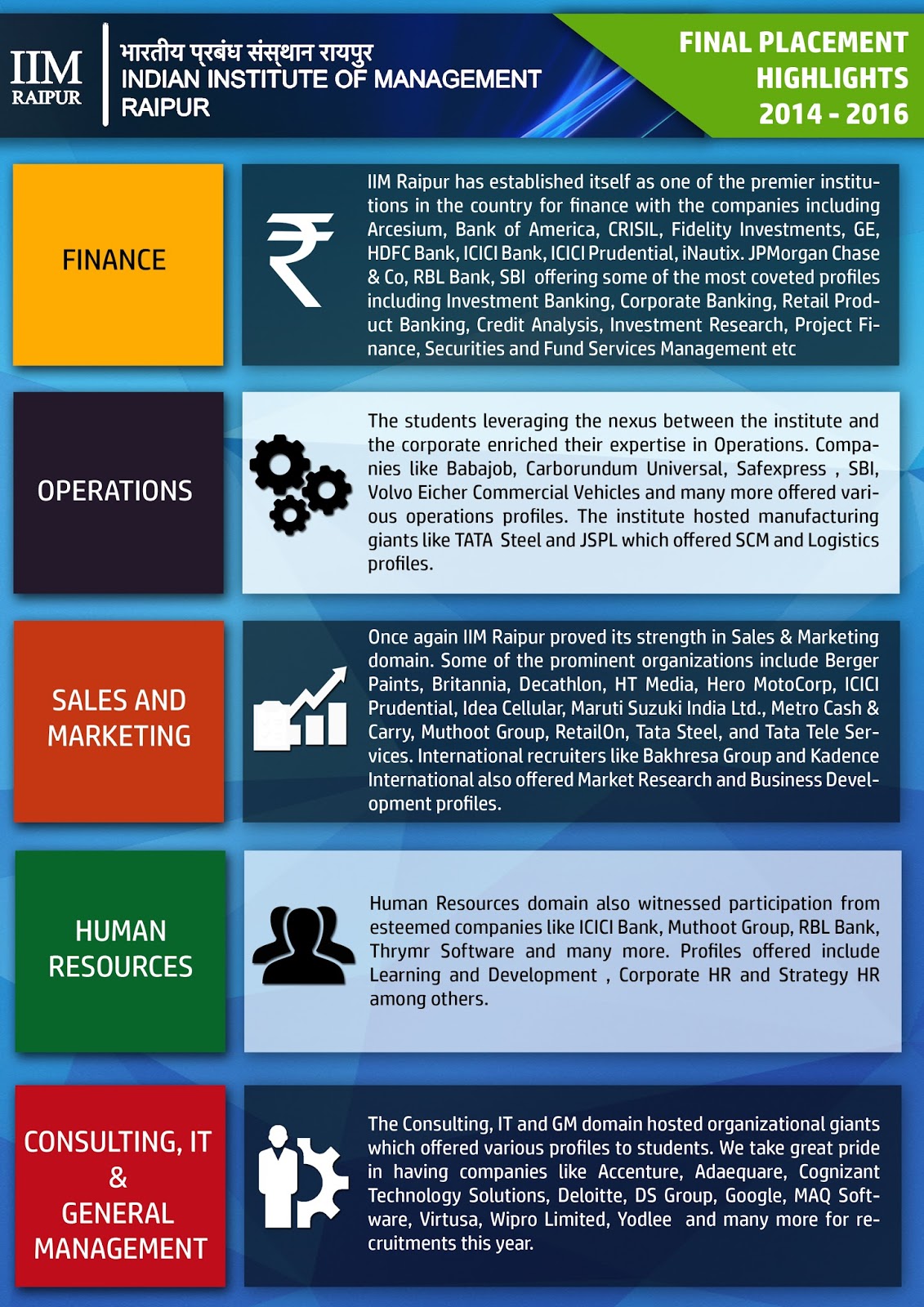 IIM Raipur proudly announces another successful year of placements. Backed by strong industrial relations, the placement season of 2015-16 witnessed an overwhelming participation from previous recruiters along with a host of new recruiters vying for some of the country's best minds.