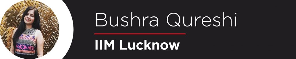 Bushra Qureshi hails from the orange city of India, that is Nagpur and is currently pursuing her MBA from IIM Lucknow. She is a voracious reader and likes to read non-fiction more. A believer in the power of communication, Bushra is always ready for conversation over a cup of tea. She is exuberant and tenacious by nature. She believes strongly in the quote “Universe always falls in love with the stubborn heart”.