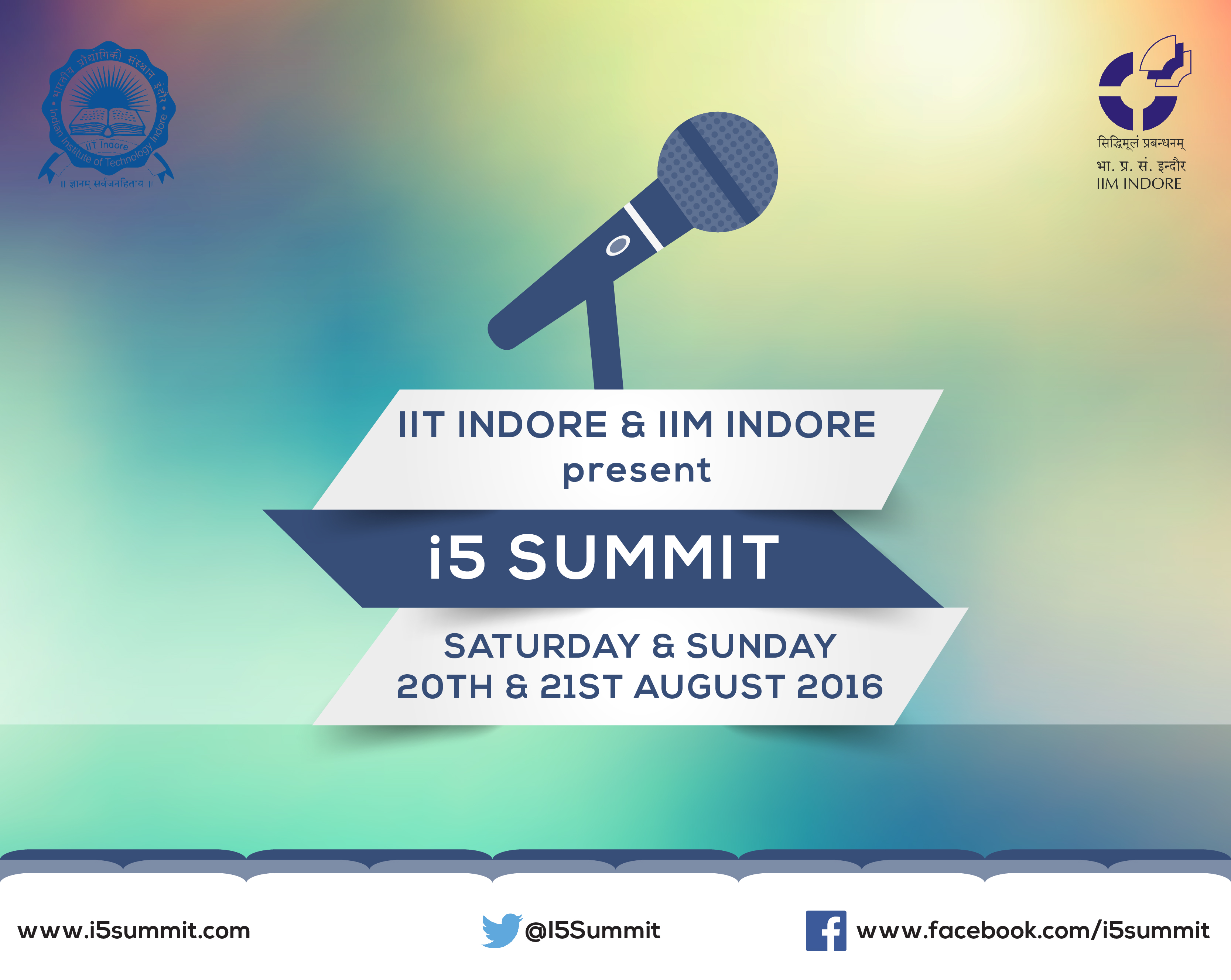 To provide the entrepreneurial spirit with an outlet for the student's creativity and ambition, IIM Indore and IIT Indore have come together to conduct the i5 Summit on 20th and 21st of August 2016 at IIM Indore. The i5 Summit is a unique collaboration designed to foster entrepreneurship and innovation.