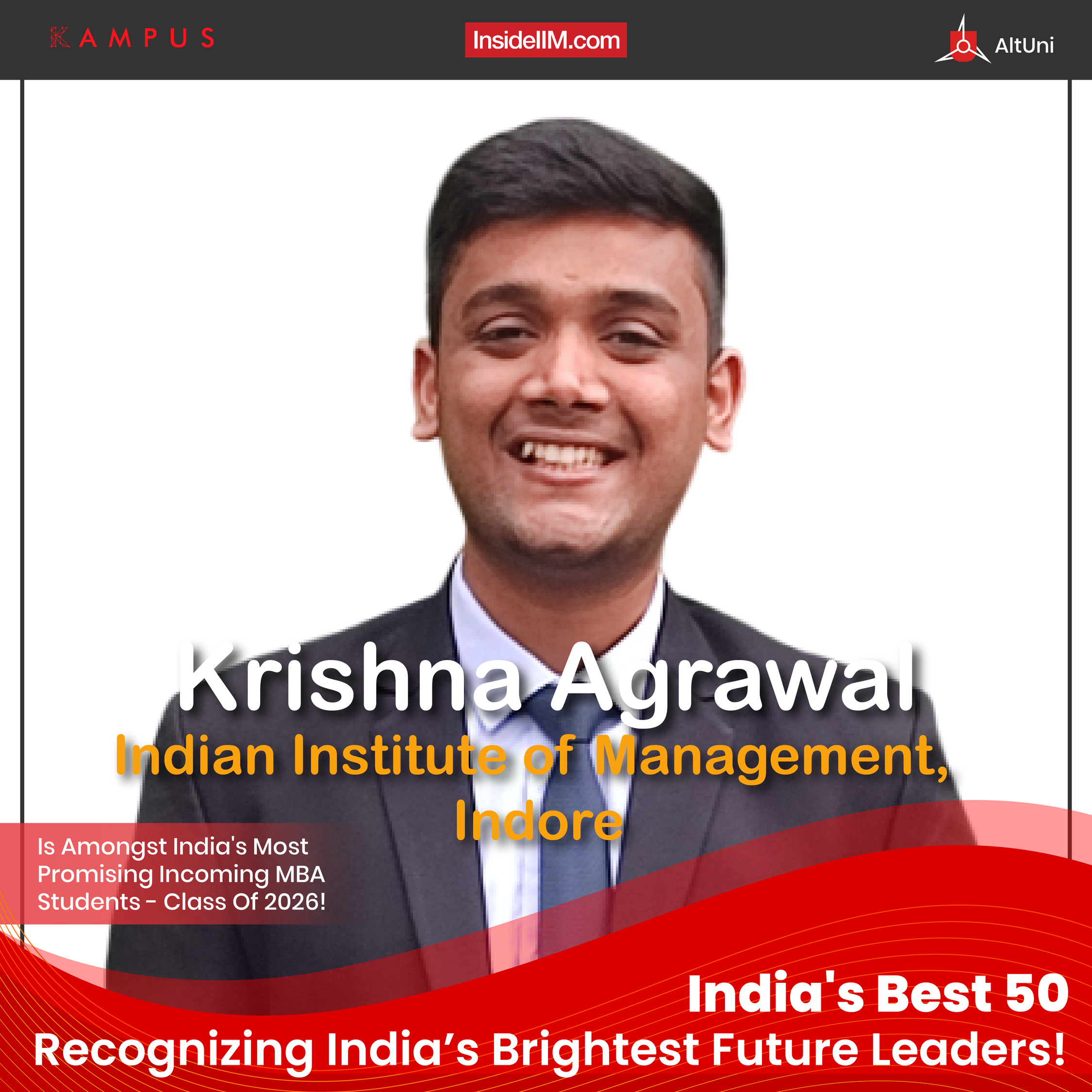 Selected to the Best 50 of India's Most Promising Incoming MBA Students 2024, Krishna Agrawal blends values-first leadership with large-scale execution. A Biomedical engineer from NIT Raipur now at IIM Indore, he has run complex, multi-stakeholder work—leading a ₹30L cultural fest with a 220-member team and 8,000 attendees, and organising TEDx NIT Raipur with ₹2L in sponsorships and 10+ partners—while keeping decisions transparent (owning tough calls with sponsors) and teams aligned. Beyond campus, he’s driven community initiatives (Volunteer for India, Earth Day) and earned national recognitions (Y-20 delegate; Nestlé Leaders League; Wipro Earthian; Upraised Embark), all while upskilling across data and digital.