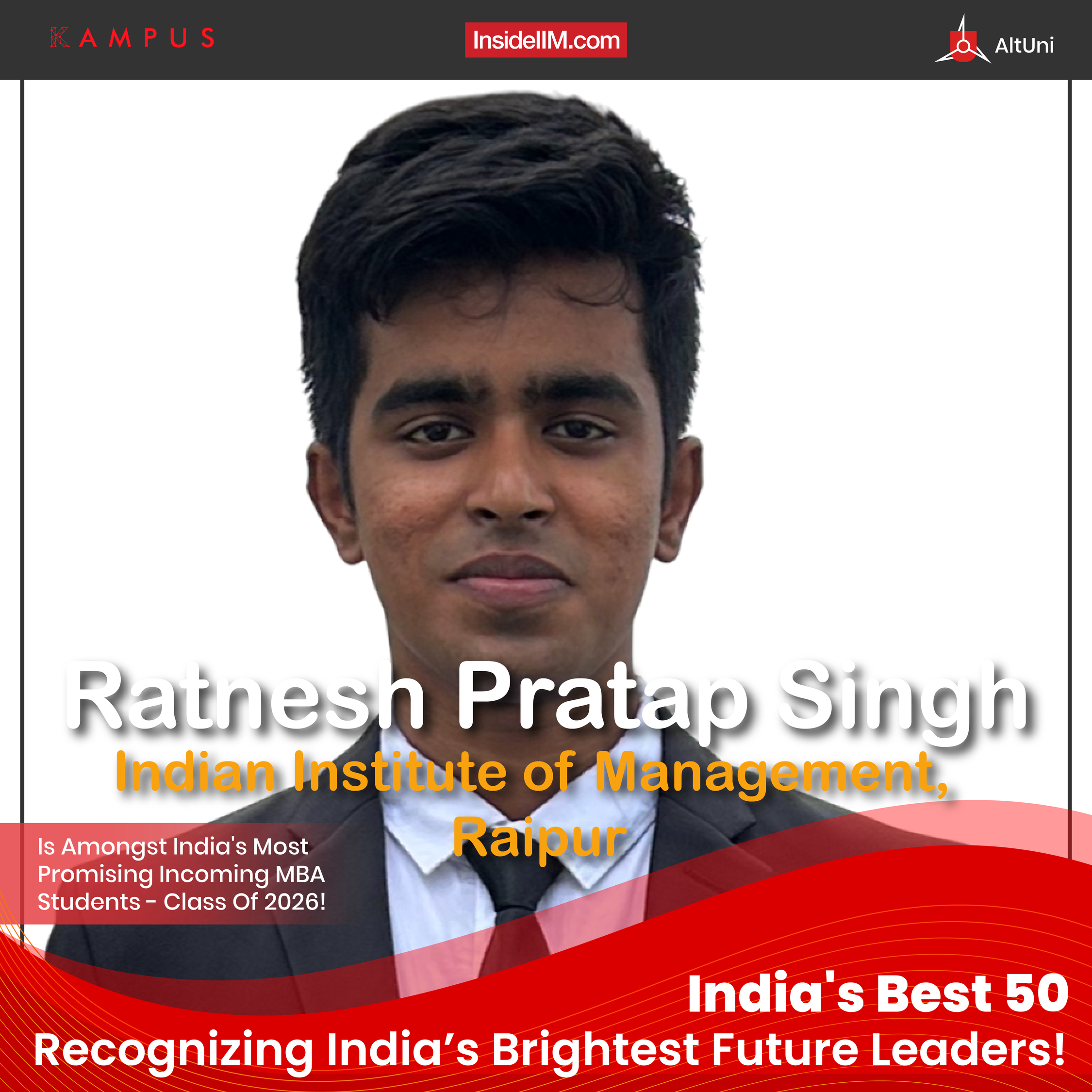 Selected to the Best 50 of India's Most Promising Incoming MBA Students 2024, Ratnesh Pratap Singh blends engineering rigor with people-first delivery. At Infosys, he turned around a slipping deliverable on an escalated timeline and earned leadership appreciation; earlier, he represented India at a global camp in Japan and helped run campus initiatives (department magazine, debate forums). Across moves between states and roles (front-end to data engineering), he shows the same rhythm: break problems down, align stakeholders, finish strong. At IIM Raipur, he plans to layer strategy on his data toolkit to lead high-impact, innovation-driven work.