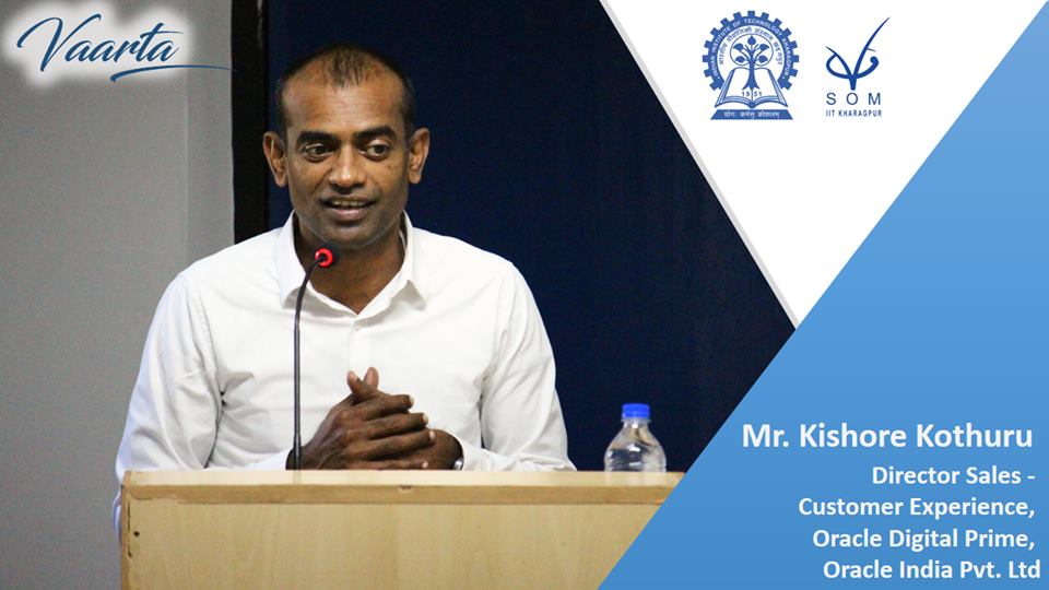 The Digital Whirlwind currently permeating every territory of modern human civilisation is rapidly throwing old business strategies out of gear. Organisations across all industries, which at some point of time were content with vanilla offerings delivered similarly for every customer and uniformly across channels of engagement, are now having to go under the hood of their processes in unprecedented ways. Managers in stimulating situations as these are having to imperatively summon their imagination and dedication to steward their organizations towards sustained success. Thus, taking cognizance of trends as these, the Vinod Gupta School of Management, IIT Kharagpur, invited Mr. Kishore Kothuru, Director Sales - Customer Experience, Oracle Digital Prime at Oracle India Pvt. Ltd to address the budding managers of the Institute.
